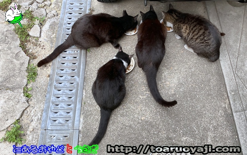 ・夕方は・・ 5匹 全員集合だぁ・・ヾ(*'。('ー'*)ノ ・西日が・・ 厳しいので・・ 日陰で・・ 三つ子の兄妹 と 六ちゃん・・ ハチ公は・・ 奥に・・(^○^) アハハ ・黒丸っち・・ヾ(*'。('ー'*)ノ